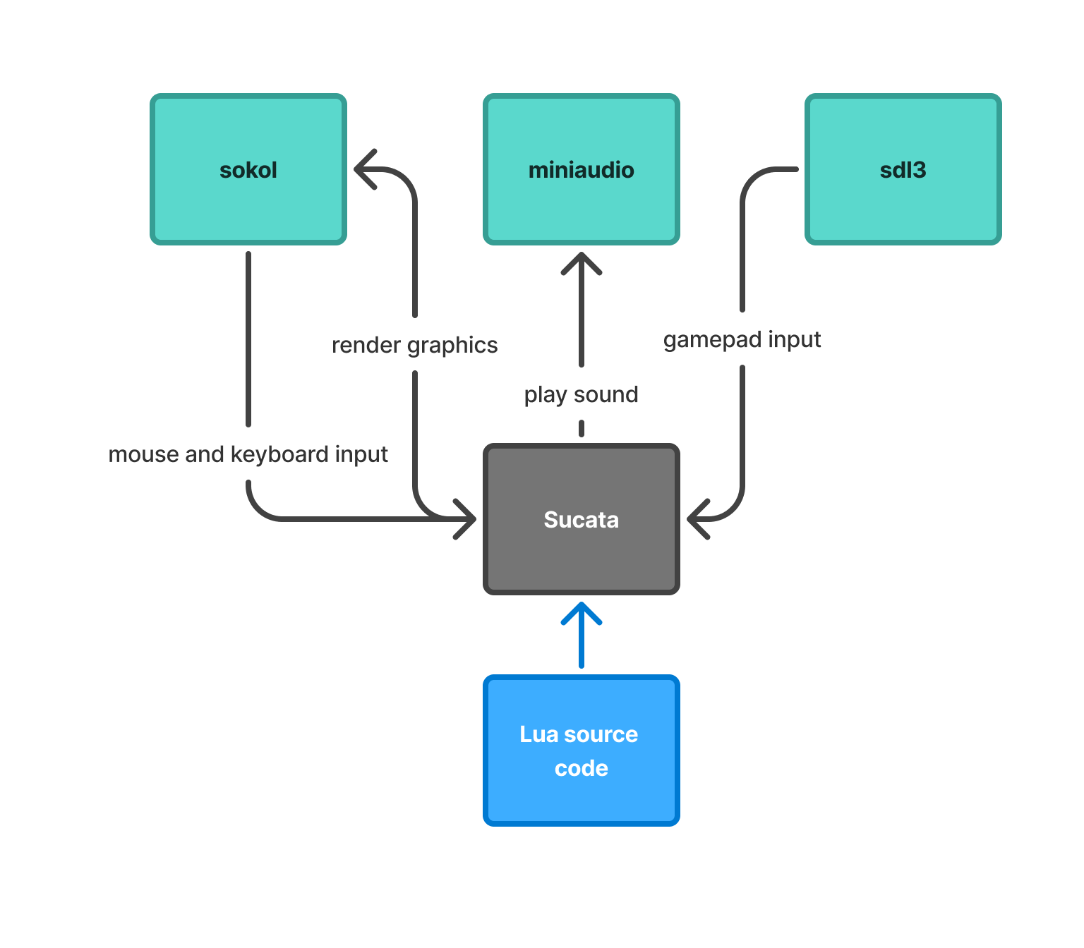 The engine interprets the lua source code, registering actions, calling sokol for graphic render, miniaudio for play audio, receiving gamepad input from sdl, keyboard and mouse inputs from sokol, and any events call back some lua functions