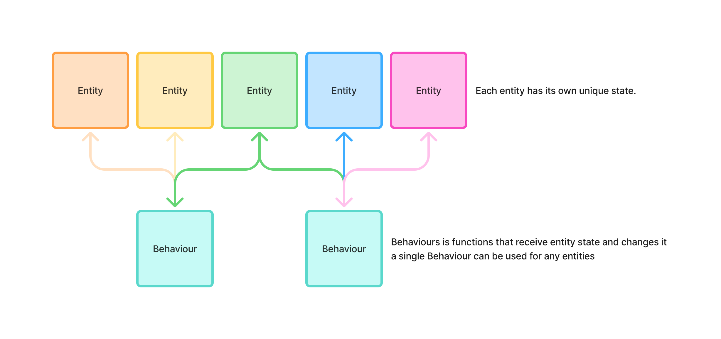 An entity is a table that contains state and behaviours, state is unique for the entity, behaviours it is scripts can be reused